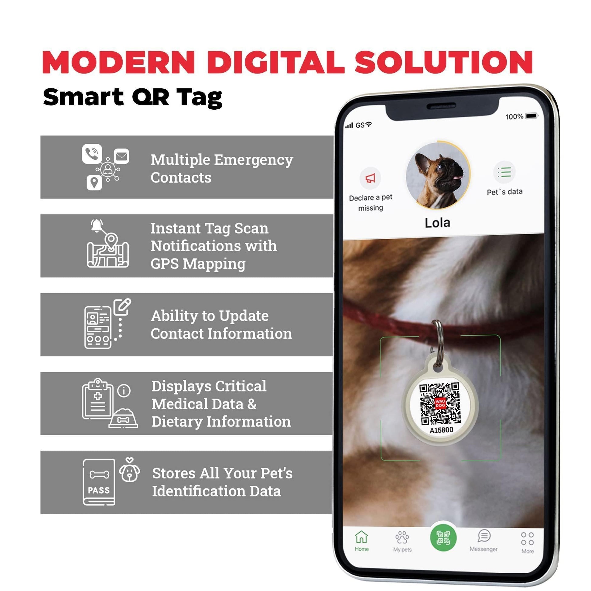 Etiqueta de Identificación Inteligente - Ten mayor tranquilidad con el arnés ajustable moderno WAUDOG con una Etiqueta de Identificación Inteligente que tiene un código QR único y una aplicación multifuncional gratuita para asegurarte de encontrar a tu perro si decide experimentar más libertad.